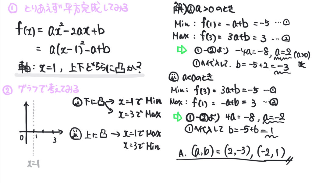 2次関数 \(f(x)=ax^2-2ax+b\) ( \(a,b\)は定数) は区間\(0≦x≦3\)における最大値が3最小値が\(-5\)である。このとき、\(a,b\)の値の組みを全て求めよ(名城大)