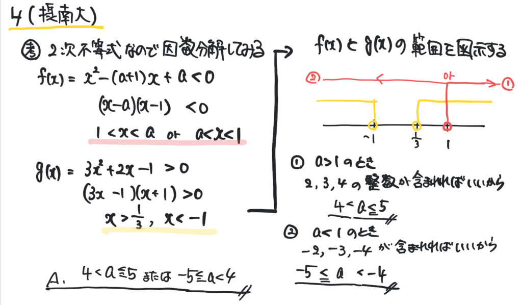 問題解説\(x\)についての2次不等式\(x^2-(a+1)+a<0, 3x^2+2x-1>0\)を同時に満たす整数\(x\)がちょうど3つ存在するように定数\(a\)の値の範囲を求めよ