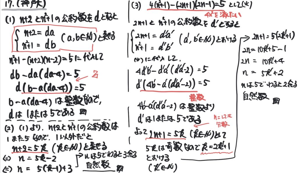- 3) (1)(2)を参考にして、\(2n+1とn^2+1\)が1以外に公約数を持つような自然数\(n\)をすべて求めよ