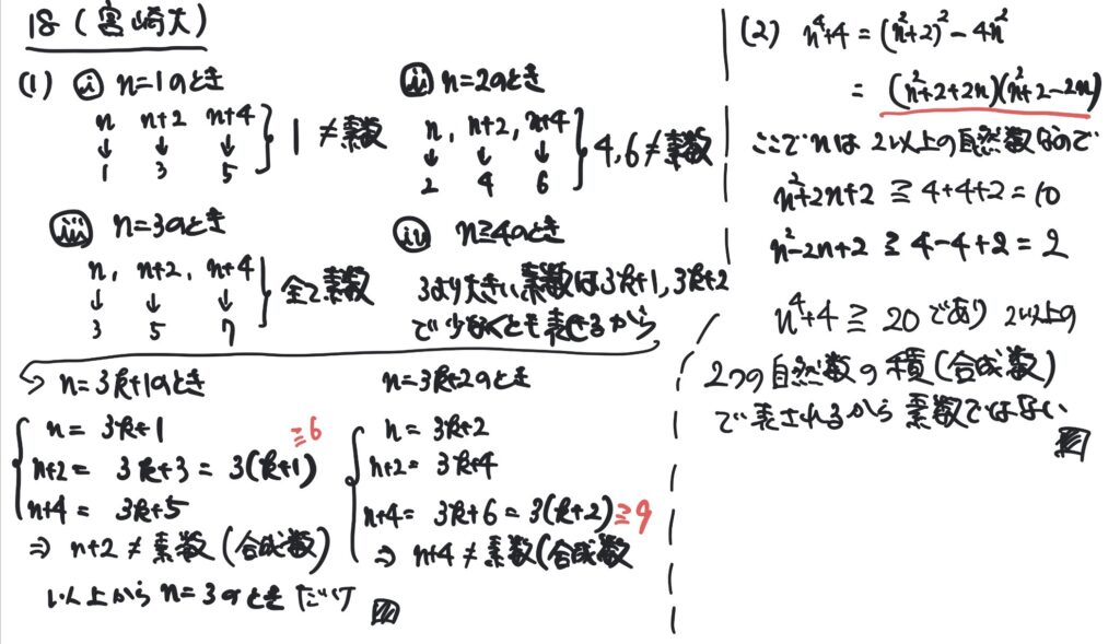 (2) \(n\)を2以上の自然数とするとき\(n^4+4\)は素数にならないことを示せ