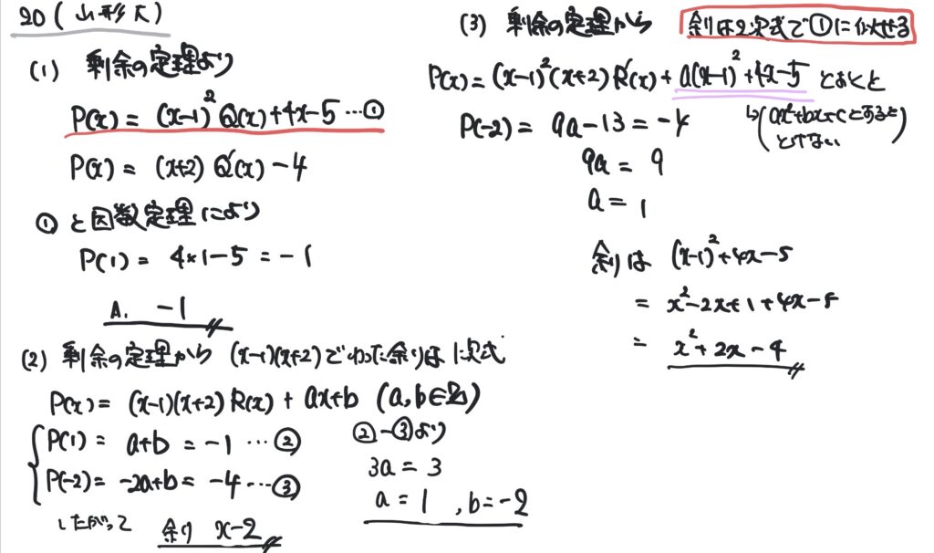 • (2) \(P(x)\)を\((x-1)(x+2)\)で割ったときの余りを求めよ