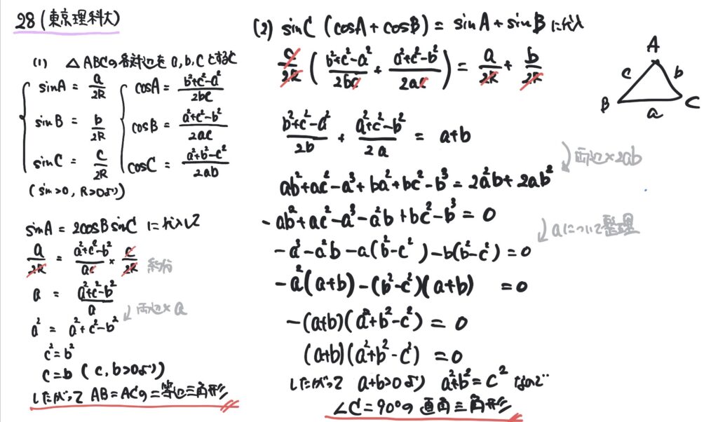 とりあえず、正弦定理と余弦定理を使って各式を表してみた。その後、辺の長さだけの式になったら\(a\)について整理したらうまくいった